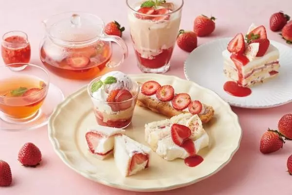 セット限定苺スイーツは、1月7日(木)から1月27日(水)までの第1弾、1月28日(木)から2月24日(水)までの第2弾で変更。第1弾は、苺とくちどけのよいホイップクリームなどをサンドした「苺のサンドイッチ」、苺カスタードクリームと杏仁クリームをコンビネーションした「苺と杏仁クリームのエクレア」、チャイプリンやストロベリーアイスを合わせた「苺とチャイプリンのパフェ」を味わえる。