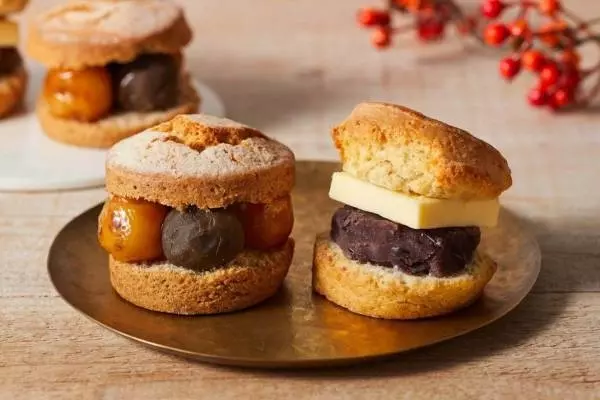 冬季限定の「スコーンサンド ほうじ茶餡とみたらし団子」は、風味豊かな全粒粉スコーンにもちもち食感の“みたらし団子”を合わせた新食感スコーン。京都の“焙じ茶”を濃い目に使用した上品な香りのほうじ茶餡をプラスし、甘じょっぱい和テイストに仕上げている。紅茶やコーヒーのみならず、日本茶との相性も抜群で、新年の手土産にもぴったりだ。