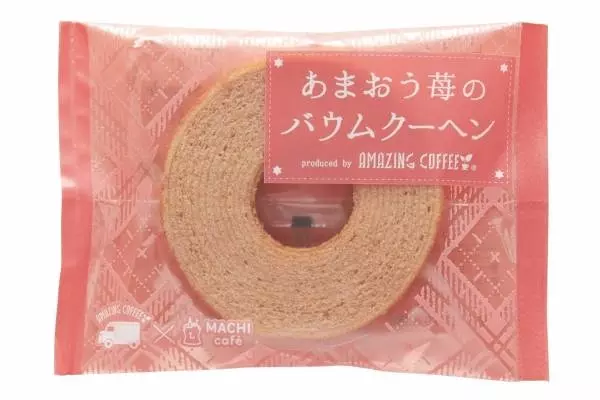 「あまおう苺のバウムクーヘン Produced by AMAZING COFFEE」は、あまおう苺のピューレ・パウダーを使用したふんわり食感のバウムクーヘン。ホワイトチョコを効かせたコクのある味わいとなっている。
