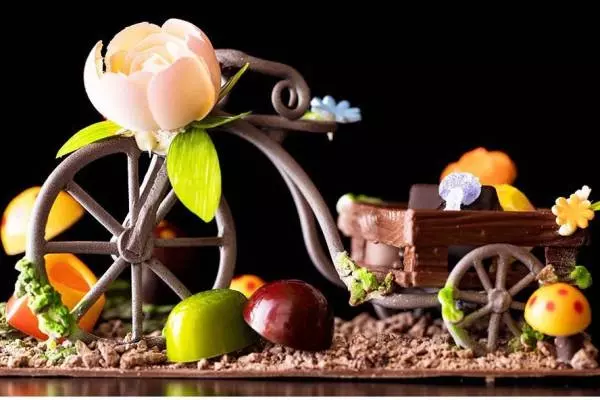 注目の新作チョコレートは、フランス語で「花の贈り物」を意味する「キャド ド フルール」。"春の野"をイメージして、ガーデニングのプランターを積んだ自転車をチョコレートで再現した。プランター型のチョコレートには、ローズや、ラベンダー、ジャスミンなどのフレーバーのボンボンショコラを詰め込み、カラフルで華やかな見た目に仕上げた。アートのように繊細なチョコレートは、10セット限定で発売する。