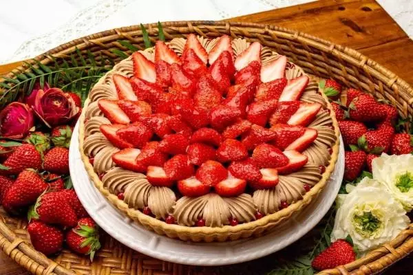 「イチゴとチョコレートクリームのタルト」は、サクサクのタルト生地に、クリーミーな自家製チョコレートカスタードと甘酸っぱいジャムを重ねて、トップに花のようにイチゴを飾りつけた。こだわったのは、イチゴとチョコレートクリームの味わいのバランスで、イチゴを囲むようにして、やさしいくちどけのチョコレートクリームをデコレーションしている。