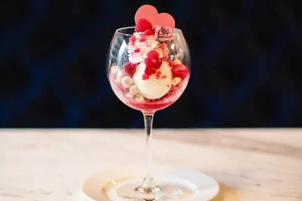 「薔薇とラズベリーのコッパ」は“初恋の味”をテーマにした限定パフェ。ヨーグルトソルベをベースに、薔薇やラズベリーのクリームとフレッシュなラズベリーを飾り、薔薇の花びら入りクランブルで食感のアクセントを加えた。ルビーチョコレートで作ったハートのデコレーションには、金粉をふりかけ、特別感をUP。