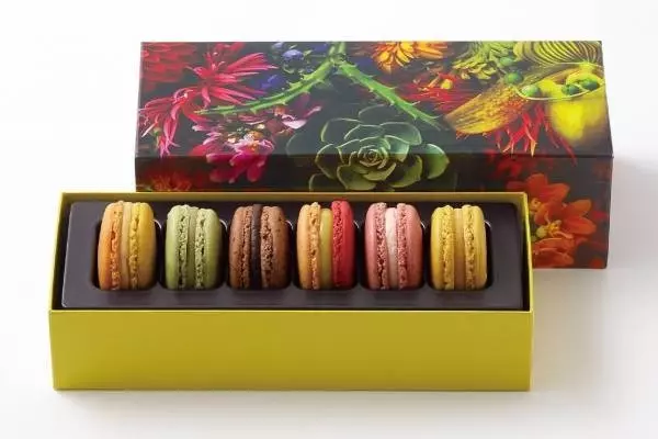 その仕上がりは、まるで花々の香りが漂ってきそうなほどにリアルで生命力に漲っている。花々で彩られた可憐なボックスは、色とりどりのマカロンとマッチする。