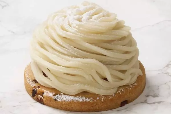 「アン・モンブラン」は、プラリネから発想を得たモンブラン仕立てのスイーツ。カシューナッツのペーストと白あんを合わせたクリームを、スイートチョコレートムースの上にモンブランのように絞っている。ベースの焼き菓子は、砂糖の代わりにあんを使うことで、干菓子のような食感に仕上げた。