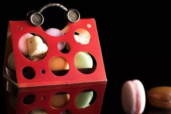 2021年はアイコニックなデザインはそのままに、装い新たにシックな赤色で登場。チョコレートでできたバッグの中には、カラフルなマカロンをイン。チョコレート、ピスターシュ、アプリコット、フランボワーズ、カシスの5種類のフレーバーを詰め込んでいる。また、ほのかな酸味が効いたフランボワーズ&ライチフレーバーのハート型チョコレートも、新たに仲間入りした。
