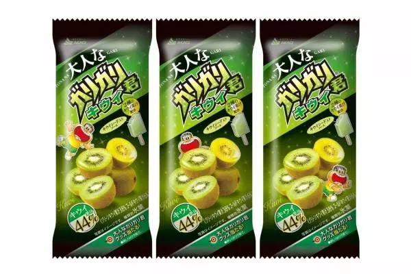 「大人なガリガリ君キウイ」は、キウイ味のアイスキャンディーにジューシーなキウイ味のかき氷を入れた新作。グリーンキウイとゴールデンキウイの2種類の果汁を44%使用し、キウイ本来の甘酸っぱくジューシーな味わいを再現した。