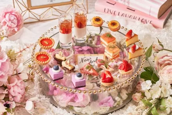 「N.Y.アフタヌーンティー~ストロベリー&チーズ~」では、甘酸っぱい苺とチーズのコンビネーションを楽しめるスイーツやフードが並ぶアフタヌーンティーセットを提供。春のニューヨーク・セントラルパークをイメージした、フラワーガーデンのような食器の上に、なめらかな特製NYチーズケーキをはじめ、爽やかなフロマージュブランに紅茶、苺を合わせたゼリー、ベリーコンポートグラノーラなど、華やかなスイーツが勢揃いする。