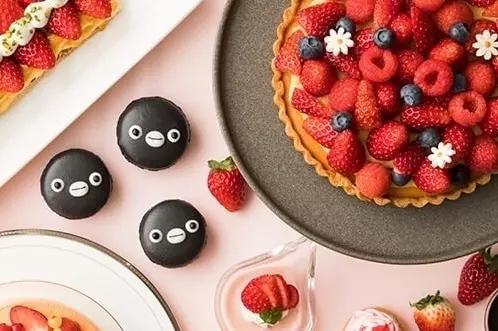 人気の「Suicaのペンギン」をモチーフにしたデザートも用意しており、苺&チョコレートガナッシュを組み合わせた新フレーバーのマカロンや、優しい甘さの苺杏仁プリンなどを味わうことができる。
