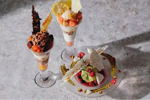 さらに「アールグレイ&シトラス」は、レモンの酸味とほんのりとした苦味をもつイタリア産「リモンチェッロ」に、アールグレイを合わせたパフェ。グラスにはレモンミルクのソルベやレモンクリーム、グレープフルーツの果肉に、 紅茶とオレンジのパウンドケーキ、アールグレイミルクのアイスクリームを重ね、リモンチェッロが香る洗練されたデザートに仕上げている。
