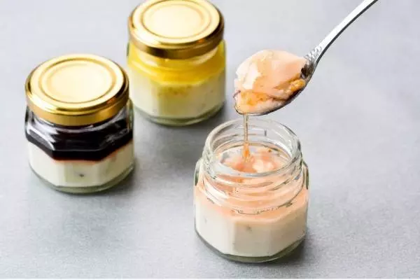 瓶に入った「スイートリップ×コガネイチーズケーキ」は、そのままスプーンですくって味わうのはもちろん、よく混ぜてディップ風に味わってもOK。ちょっぴり溶かすとシャリシャリの食感、じっくり溶かしていくと、トロトロねっとりとした食感へと変化が楽しめる。