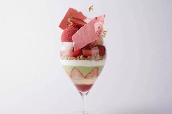 3月限定で展開する「ベリーとピスタチオのパフェ」は、金箔がアクセントとなった繊細な飴細工と、苺風味のピンクのメレンゲが目を引く春らしい華やかなパフェだ。