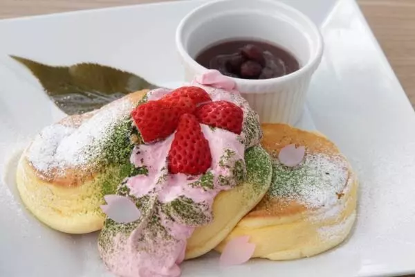「幸せの桜パンケーキ」は、「幸せのパンケーキ」自慢のふわふわ食感のパンケーキに、桜香るホイップクリームと苺の果実、抹茶パウダーなどを合わせた一品。