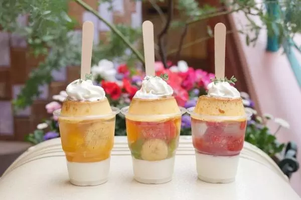 商業施設への初出店となる「フツウニフルウツ舞浜出張所」では、定番のフルーツサンドに加え、キュートなルックスのスイーツやドリンクも発売。中でも注目は、舞浜出張所限定で販売する「プリンアラモード」だ。透明なカップに彩り豊かな旬のフルーツを入れ、その上になめらかなプリンと生クリームをトッピングした。
