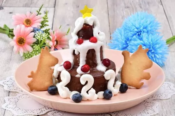 「ムーミン一家 お祝いケーキ」は、星やクリームなどがデコレーションされた三段のチョコレートケーキ。ケーキの周りには、まるでお祝いしているかのような姿の愛らしいムーミンとムーミンママのクッキーをセットし、より一層キュートな見た目に仕上げた。