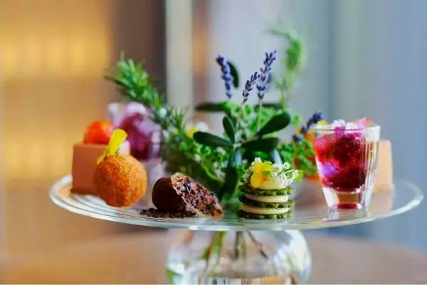 「ボタニカルアフタヌーンティー」では、スーパーフードや季節のフルーツをふんだんに使用。フォーシーズンズホテル京都で初となる女性ペストリーシェフが作り上げる、ギルトフリーのメニューがラインナップする。