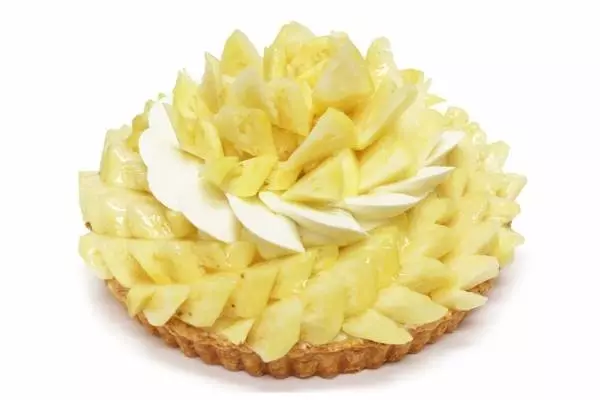沖縄県石垣島産の品種「ピーチパイン」をメインに使用したケーキは、クリームチーズをベースに、宮古島の雪塩を加えた塩味のあるクリームをたっぷりと合わせた。カフェコムサらしい、華やかな飾り付けにも注目だ。