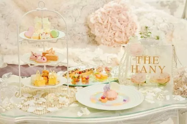 「ハッピーハニーアフタヌーンティー- Loves THE HANY-」は、人気のウエディングドレスブランド「THE HANY」とコラボレーションしたアフタヌーンティー。デザイナー・伊藤羽仁衣が作り出すエレガントで愛らしい世界観を再現した、優しく華やかな色味のスイーツが勢揃いする。