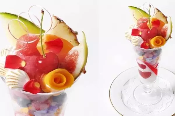 山形県産さくらんぼ“佐藤錦”や静岡県産マスクメロンをはじめ、愛知県産イチジク、高知県産小玉スイカ、長崎県産茂木びわ、宮崎県産マンゴー、沖縄県産ピーチパインといったみずみずしいフルーツを色鮮やかにデコレーション。