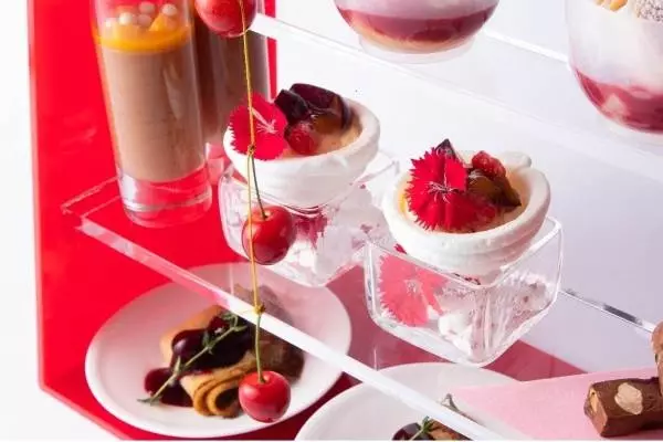 バッグ型のスイーツスタンドで運ばれる、ストーンフルーツ(果肉の中に種を抱える果実)をテーマにしたアフタヌーンティーでは、マンゴー、ピーチ、アプリコットなど、太陽の光をふんだんに浴びた果実を使用したサマースイーツが日替わりで登場する。チェリーソースをかけたクレープやカシスマカロン、マンゴーとチョコレートのムースなどこれまたキュートなひとくちサイズのスイーツが並ぶ。