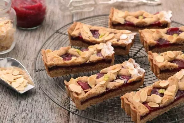 この「リンツァータルト(シュニッテン)」は、1600年代に生まれたといわれる古くから愛されているスイーツ。シナモンなどのスパイスを練りこんだ生地に、ジャムを詰めて、格子状の生地を重ねて焼き上げた菓子で、スパイシーな香りとジャムの酸味が楽しめる。