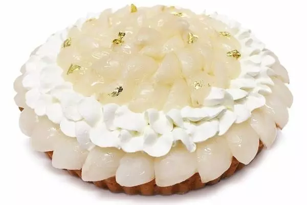 果汁たっぷりのライチに、コクのあるクリームチーズと、甘さ控えめの生クリームがマッチ。白く透き通ったライチ果肉を美しく並べた、真っ白なビジュアルも目を引く。