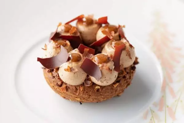 「パリ・トーキョー ショコラ・ノワゼット・パッション(仮)」は、ナッティなショコラのくちどけとパッションフルーツの爽やかな酸味のハーモニーを楽しめる、軽やかな口当たりのシュークリーム。アーモンドを散りばめて香ばしく焼き上げたショコラ風味の生地に、パッションフルーツ風味のクレームショコラとヘーゼルナッツプラリネのクリームをたっぷりトッピングした。