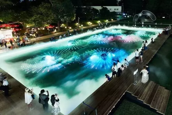 イベントのメイン企画となるのは、緑に囲まれた芝生広場に7月16日(金)から9月5日(日)まで登場する、“枯山水”をモチーフにした巨大なデジタルアート「光と霧のデジタルアート庭園」だ。ひんやりとした霧に包まれる庭園の縁側に腰を掛けながら、昼は風によって変わる霧の表情を、夜は花火や砂紋をイメージしたカラフルな光が放たれるデジタルアートを楽しめる。