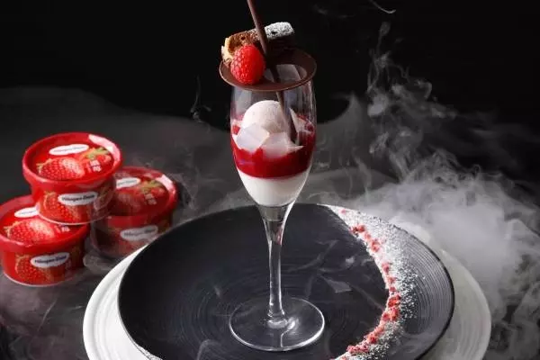 テーマは、「大人のための夜のご褒美」。7月27日発売の新作ミニカップ「濃苺」を使ったヴェリーヌを幻想的な演出と共に楽しめる特別なデザートプレート、ハーゲンダッツのアイスクリーム計8種や特製アイスクリームケーキに加え、オレンジとマンゴーにラム酒を加えたソースで楽しむ「クリスプチップチョコレート」アイスクリーム、上品な味わいの「ピスタチオのブリュレ」など、約20種の多彩なスイーツがラインナップ。ブッフェはオーダー式のため、終始席に座ったまま、ゆったりと各種スイーツを堪能出来る。