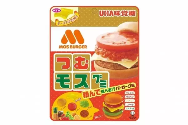 モスバーガーとUHA味覚糖のコラボレーションによる「つむモスグミ」は、バンズ、パティ、トマト、レタス、チーズ型のグミを積み上げて、まるで自分だけのオリジナルハンバーガーを作るように遊ぶことができるもの。フレーバーは、バンズ型がオレンジ、パティ型がコーラ、トマト型がストロベリー、レタス型がマスカットとなっている。
