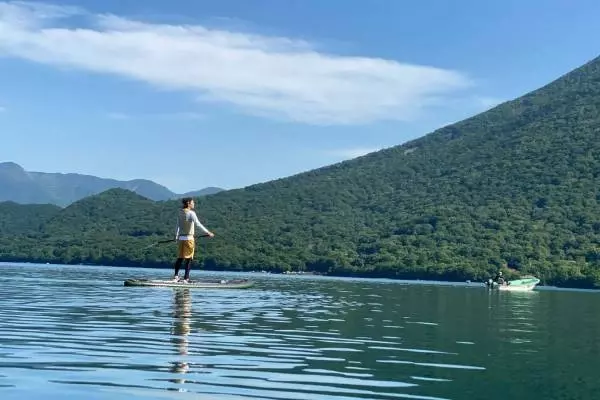 中禅寺湖湖畔の絶好のロケーションを活かしたアクティビティは、日帰り旅行でも楽しむことができる。ボートの上に立ち、パドルを漕いで水面を進むウォーターアクティビティSUP(サップ)に加え、カヤックと釣りを用意。四季折々に異なる穏やかな自然の風景も魅力で、特に秋の紅葉シーズンには、中禅寺湖から赤や黄色に染まった山々を眺められる。
