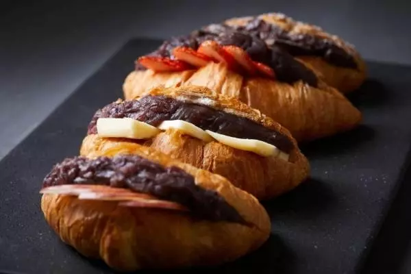 フレーバーは、あんこ本来の味わいをシンプルに堪能出来る「あんクロワッサン」、風味豊かな発酵バターを贅沢にサンドした「バターあんクロワッサン」、カットした日替わりフルーツを合わせた「フルーツあんクロワッサン」、フランス産ビターチョコレートで大人の味わいに仕上げた「ショコラあんクロワッサン」の4種類。