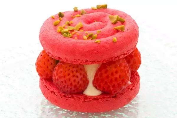 シチリア産ピスタチオのペーストとバニラアイスクリーム、軽井沢で採れた新鮮なイチゴをマカロン生地でサンドした「マカロン グラッセ オ フレーズ エ ア ラ ピスタッシュ」、マロングラッセとバニラアイスクリームをヘーゼルナッツのマカロン生地でサンドした「マカロン グラッセ オ ノワゼット エ マロン」の2種類のフレーバーが用意されている。