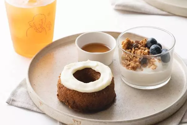 モーニングメニューの注目は、「キャロットケーキ」で有名な焼き菓子専門店「さらさ焼菓子工房」が監修する新感覚のスイーツ「キャロットケーキドーナツ」。にんじんの自然な甘みとスパイスの効いたしっとりしたドーナツにチーズフロスティングをトッピングし、さっぱりとした口当たりに仕上げた。有機食材を贅沢に使用した体に優しい「コエ ドーナツオリジナルグラノーラ」と一緒に提供されるのも嬉しいポイントだ。