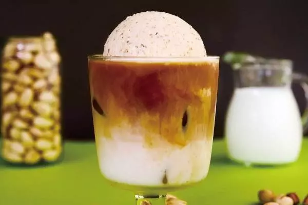 特別なエスプレッソで作るカフェラテにピスタチオアイスを浮かせて