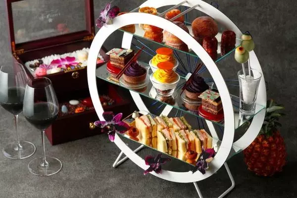 アイコニックな“観覧車型”のティースタンドに並ぶのは、紫芋のスイートポテトタルトやかぼちゃクリームのモンブランなど秋の素材を贅沢に使用したスイーツなど。“目玉”モチーフのロリポップやスパイダーチョコレートなどハロウィンらしい遊び心溢れるデコレーションも散りばめられている。