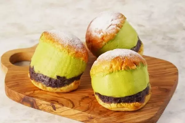 繊細な口当たりのパン生地に挟むのは、京都府産宇治抹茶と北海道産生クリームを合わせた特製クリームとつぶあん。また、クリームの中には沖縄産黒糖のわらびもちを忍ばせることで、もちもちとした食感のアクセントをプラスしている。