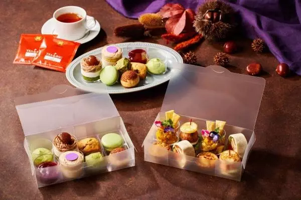 「オータムアフタヌーンティーセット」は、栗やカボチャなど秋の食材を贅沢に使用したアフタヌーンティーだ。ホテルのラウンジおよびレストランで提供する「プレミアムモンブラン アフタヌーンティー」の一部メニューを自宅で楽しめるよう、テイクアウトメニューとして提供する。