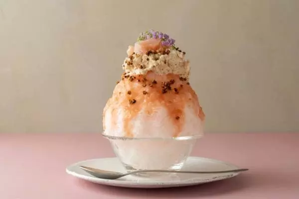 「桃とエルダーフラワーヘーゼルナッツクリーム~しその香り~」は、上品な甘みの京都産桃ソースに、マスカットのようなフルーティーさが特徴のエルダーフラワーシロップを合わせたかき氷。最後に香ばしいナッツクリームとさっぱりとした穂紫蘇をトッピングすることで、味わい豊かに仕上げた。
