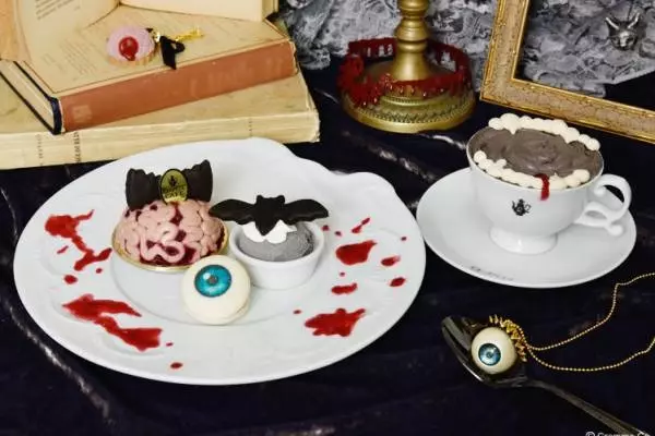 中でも注目したいのは、3種類のスイーツを楽しめる「眼帯オバケちゃんの脳みそケーキプレート」。表面に“溢れ出す血”のようなベリーのジュレをデコレーションした「脳みそケーキ」やコウモリ型のクッキーをトッピングしたした黒ゴマアイスクリーム、アップルシナモンフレーバーの「めだマカロン」またはハロウィンシーズンの人気者「ジャック・オー・ランタン」がモチーフのかぼちゃフレーバーから選べるマカロンが並ぶ。