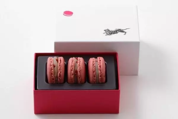 「マカロン アズキ」は、限定ボックス付きの3個セットで販売。ボックスには、とらやを象徴する虎のイラストと、ピエール・エルメ・パリを代表するマカロンのモチーフが描かれている。