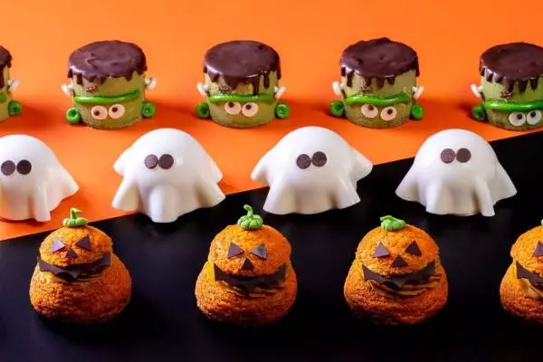 アラカルトで販売される、テイクアウトも可能なハロウィン限定スイーツも登場。抹茶や小豆などが織りなす和のテイストと愛らしい表情が魅力の「フランケンシュタイン・チーズケーキ」や、ジャック・オー・ランタンに見立てた「パンプキン・シュークリーム」、オバケに化けた「ゴースト・モンブラン」など遊び心にあふれたスイーツが勢揃い。