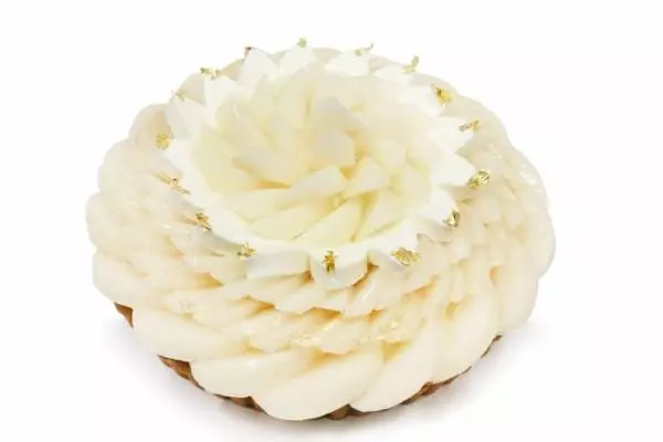 「新美月/新王」のケーキに使用される梨は、新潟県産の新品種で、ほとんど市場に流通していない「新美月」と「新王」。シャキシャキとした食感の「新美月」「新王」のいずれかを、まろやかな甘みのパンナコッタと共に贅沢に飾り付けた。ベースにあしらったマスカルポーネとの相性も抜群だ。