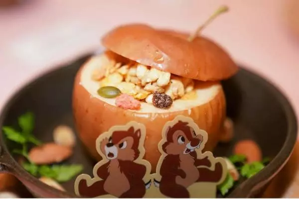中でも注目は、「チップ&デール」の大好物“リンゴ”を丸ごと1つ使用した「丸ごとリンゴのグラノーラ」。中にヨーグルトとグラノーラを詰め込んだヘルシーなスイーツだ。大好きなリンゴを目の前に喧嘩をするキュートな2人のプレートが飾られている。