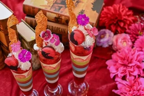 また、カラフルなスイーツも勢揃い。華やかな「キュートベリー(飲むショートケーキ)」や様々なハートモチーフを飾った「天使の誘惑(ハートのダークチェリームース)」、カラフルな層を重ねた「妖精の幸せフルーツパフェ」など、鮮やかにデコレーションされたスイーツが揃う。