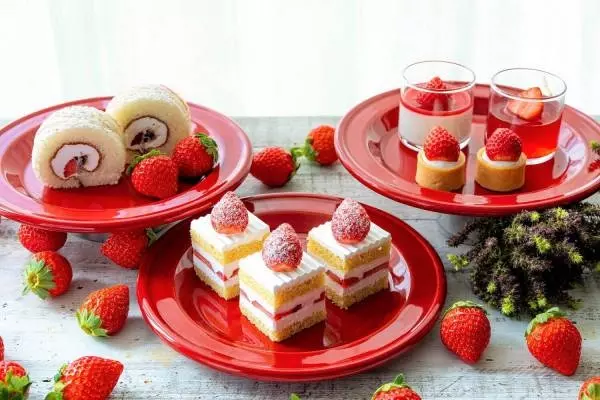 このほか、ふんわりとしたロール生地でいちご・生クリーム・黒蜜あんこを包み、仕上げにルビーチョコレートをあしらった「いちごロール」、たっぷりのいちご果汁がジューシーな「いちごゼリー」、サクサク食感の生地がたまらない「いちごタルト」など、全6種類のいちごスイーツが用意されている。