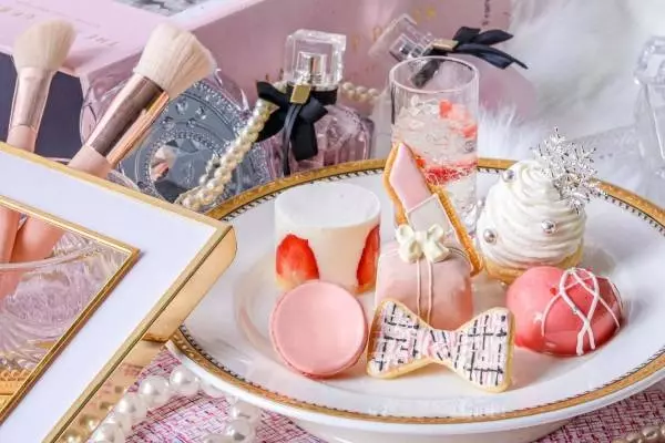 「メイクアップ ウィンターアフタヌーンティー」では、ツイードの洋服やコスメアイテムなどから着想を得たスイーツを提供。ツイードの模様をあしらったリボン型アイシングクッキーや、リップのアイシングクッキー、ベリーのハートムース等、華やかなスイーツが勢揃いする。
