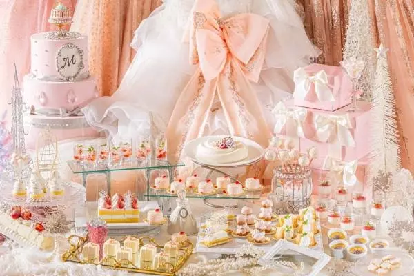 「マリーアントワネットのスイーツパーティー~ホワイトクリスマスの世界~」は、王妃マリーアントワネットの宮殿を思わせる空間の中で、卓上スイーツブッフェを楽しめるイベント。ホワイトとピンクをキーカラーに、マリーアントワネットの世界観を表現したスイーツがずらりと並び、心行くまでスイーツタイムを堪能できる。
