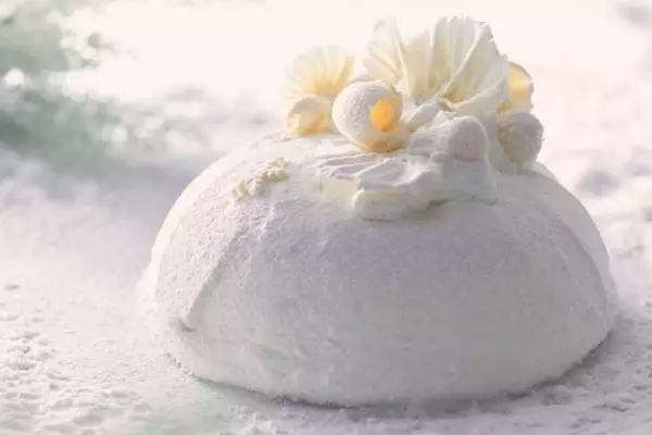 白のケーキ「ノエル・ブラン」は、白銀の雪山を思わせるオールホワイトのロマンティックなビジュアル。乳脂肪分の違う2種類の生クリームを使用して、軽やかなくちどけを叶えた「ノエル・ブラン」は“苺が見えない”苺のショートケーキというそのコンセプトもユニークだ。