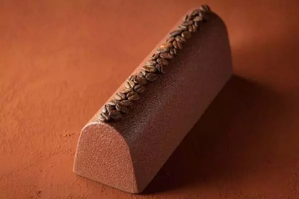 2021年のクリスマスケーキ「ビッシュ・ド・ノエル ショコラカフェ」には、マダガスカル産カカオとエチオピア産カフェをブレンドした風味豊かな65%ショコラを使用。切り分けると、マダガスカル産バニラのクリームとビスキュイの層が現れる。コーヒー豆を模した香り高いショコラのデコレーションを施して、スタイリッシュに仕上げたチョコレートケーキだ。