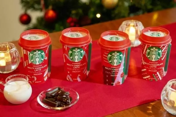 「スターバックス メルティチョコレートラテ」のパッケージは、クリスマス気分を盛り上げてくれる華やかなデザイン。クリスマスツリーを思わせるイラストや、カラフルなオーナメントを描いたものなど、4つのバリエーションを取り揃える。